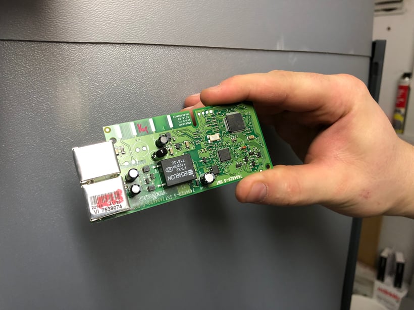 Ganz links unten zu erkennen. Das erwähnte LON Modul, das die Kommunikation zu den einzelnen "Teilnehmern" der gesamten Heizungsanlage gewährleistet.