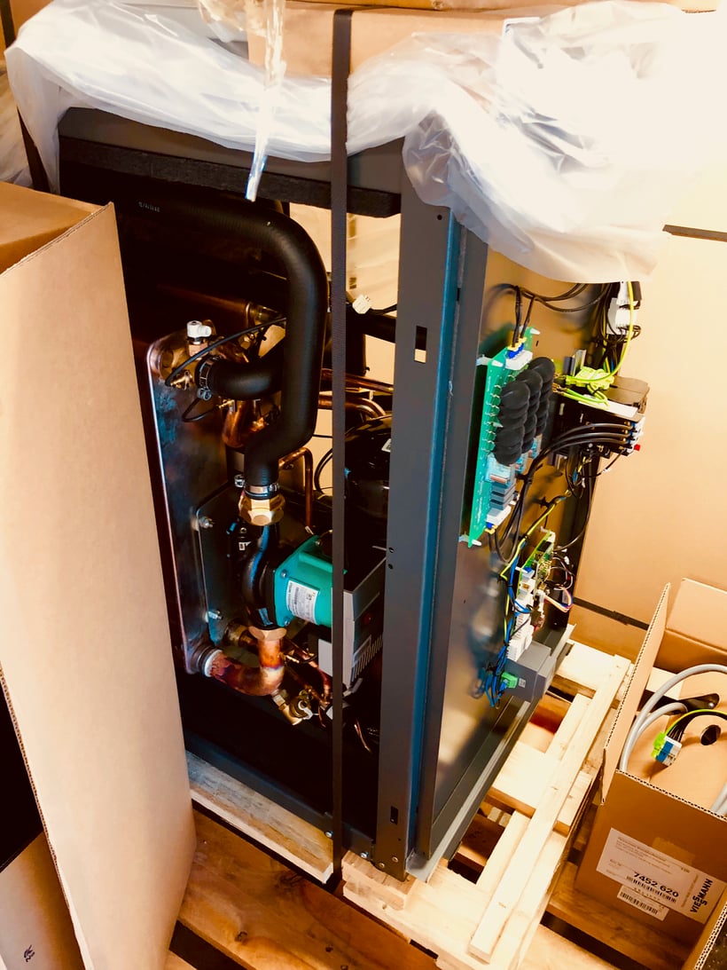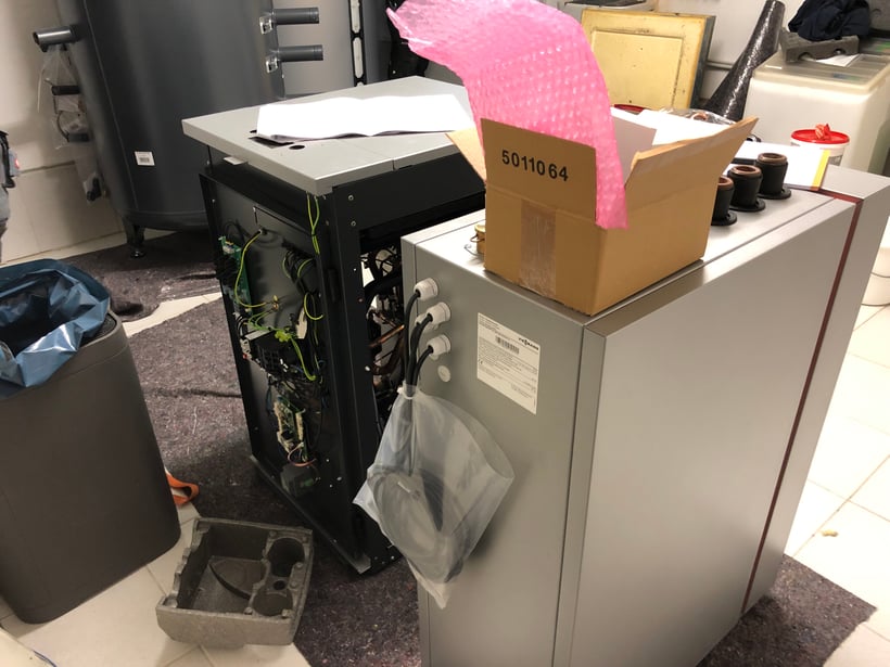 Auf dem Bild sehr gut zu erkennen, die ausgepackte Vitocal 300-G. Sehr gut zu erkennen die frontseitige tür mit der Schütz-Elektronik und weitere Verkabelung in den Deckel. Von allen Seiten sehr gut zugänglich und wartungsfreundlich.