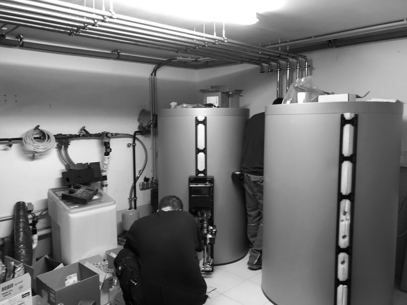 Bild zeigt die Wärmepufferspeicher für Heiz und Brauchwasser. Letztere mit der Trinkwasserstation Vitotrans 353 zu erkennen an der Steuerungsbox.
