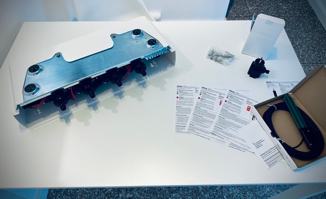 Beigeliefert ist ein Verschluss, den man an der rechten Seite der Elektronik tauscht, und dort ein KNX Kabel einführt, welches man dann mit seiner bestehenden KNX Installation verbindet.