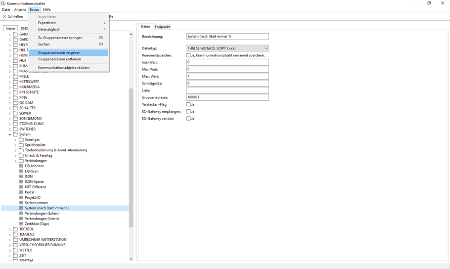 Hier kann man selbst Werte eintragen und diese dann in der KNX Installation mitbenutzen, oder man vergibt Gruppenadressen automatisch mit dem Experten. Hierfür wechselt man in die obere Taskleiste, klickt dort auf EXTRAS und klickt im Dropdown Menü auf Gruppenadressen vergeben.