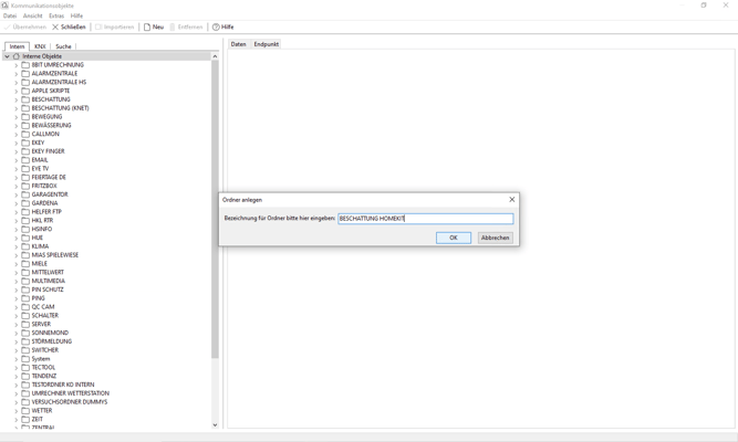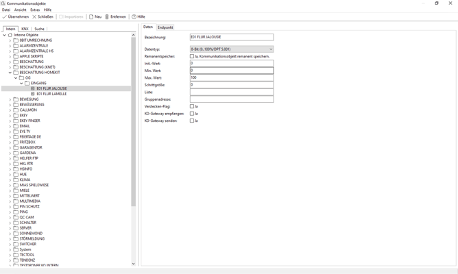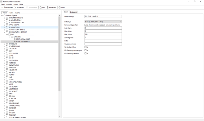 Nun lege ich interne KO's für die Beschattung des Fensters an. Eines für den Behang und eines für die Lamellenstellung. Hier muss der Wert auf 8 Bit 0-100% DPT 5.001 eingestellt werden.